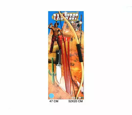 arc avec 3 flèches et poignard. dimensions: 47cm Attention!! ne convient pas aux enfants de moins de 36 mois, danger d’avaler des petites pièces. garder la feuille d’information pour une utilisation ultĂ©rieure.