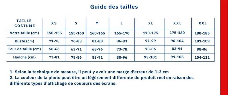 - Version : costume livré AVEC ou SANS masque (selon modèle)