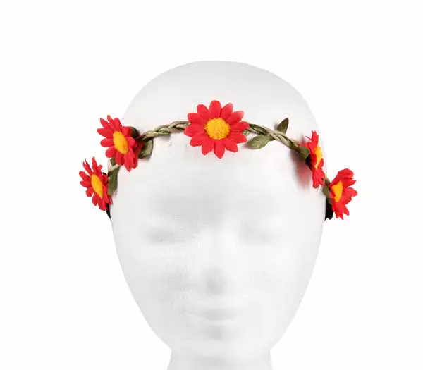 1x couronne de fleurs élastique rouge. matière 100% polyester. taille adulte. conditionnée en emballage plastique pour 50pcs achetées Attention !! ceci est un accessoire de déguisement pour adulte ! tenir loin du feu et de toute autre source de chaleur !