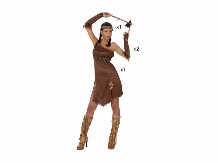 1x déguisement d’indienne marron imitation daim femme. matière 100% polyester. composé d’une robe, d’un bandeau et d’une paire de brassières. taille 44/46. vendu sans les accessoires. lavable à la main à 30°. livré dans une housse pour porte manteaux options accessoires : copier/coller le(s) code(s) en mot de recherche-collier indien : e50321-set d’armes : e50002