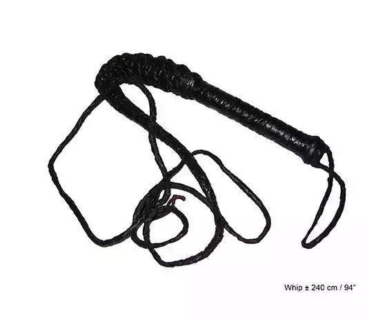 1x fouet noir. matière 100% cuir. longueur 2.4m environ. conditionné en vrac avec étiquette individuelle Attention !! ceci est un accessoire de déguisement pour adulte ! tenir loin du feu et de toute autre source de chaleur !