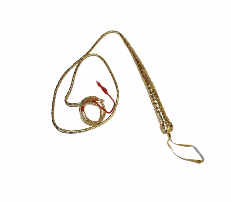1x fouet or. matière 100% cuir. longueur 1.8m environ. conditionné en vrac Attention !! ceci est un accessoire de déguisement pour adulte. tenir loin du feu et de toute autre source de chaleur !