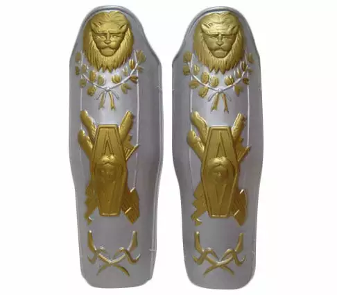 paire de protège-tibias de chevalier motif lion en plastique, taille pour adulte. Attention !! ceci n’est pas un jouet mais un accessoire de dĂ©guisement pour adulte. cet accessoire ne peut pas ĂŞtre utilisĂ© comme Ă©lĂ©ment de protection corporelle. tenir loin du feu et de toute autre source de chaleur.