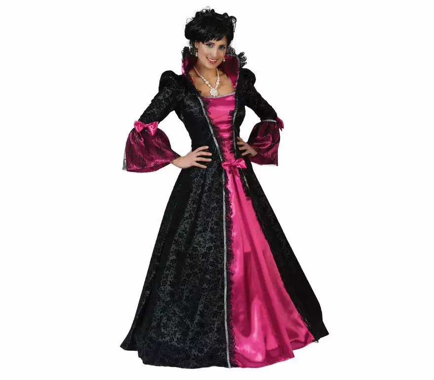 1x robe baroque victoria rose et noir. matière 100% polyester. vendue sans les accessoires. taille 48/50. lavable à la main à froid. livrée dans une housse pour porte manteaux. costume de qualité !options accessoires: copier/coller le(s) code(s) en mot de recherche-collier : 00633-perruque : e57624