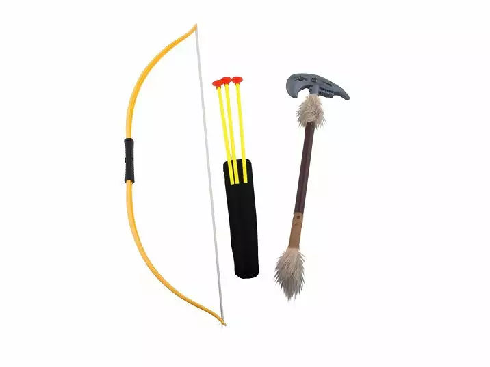 1x set d’armes d’indien 3pcs. matiĂšre 100% pvc. composĂ© d’un arc, d’une hache et de 3 flĂšches avec carquois. longueur de l’arc 72cm environ. conditionnĂ© en emballage plastique + carte carton individuel Attention !! ne convient pas aux enfants de moins de 3 ans, danger d’avaler des petites piĂšces ! tenir loin du feu et de toute autre source de chaleur !